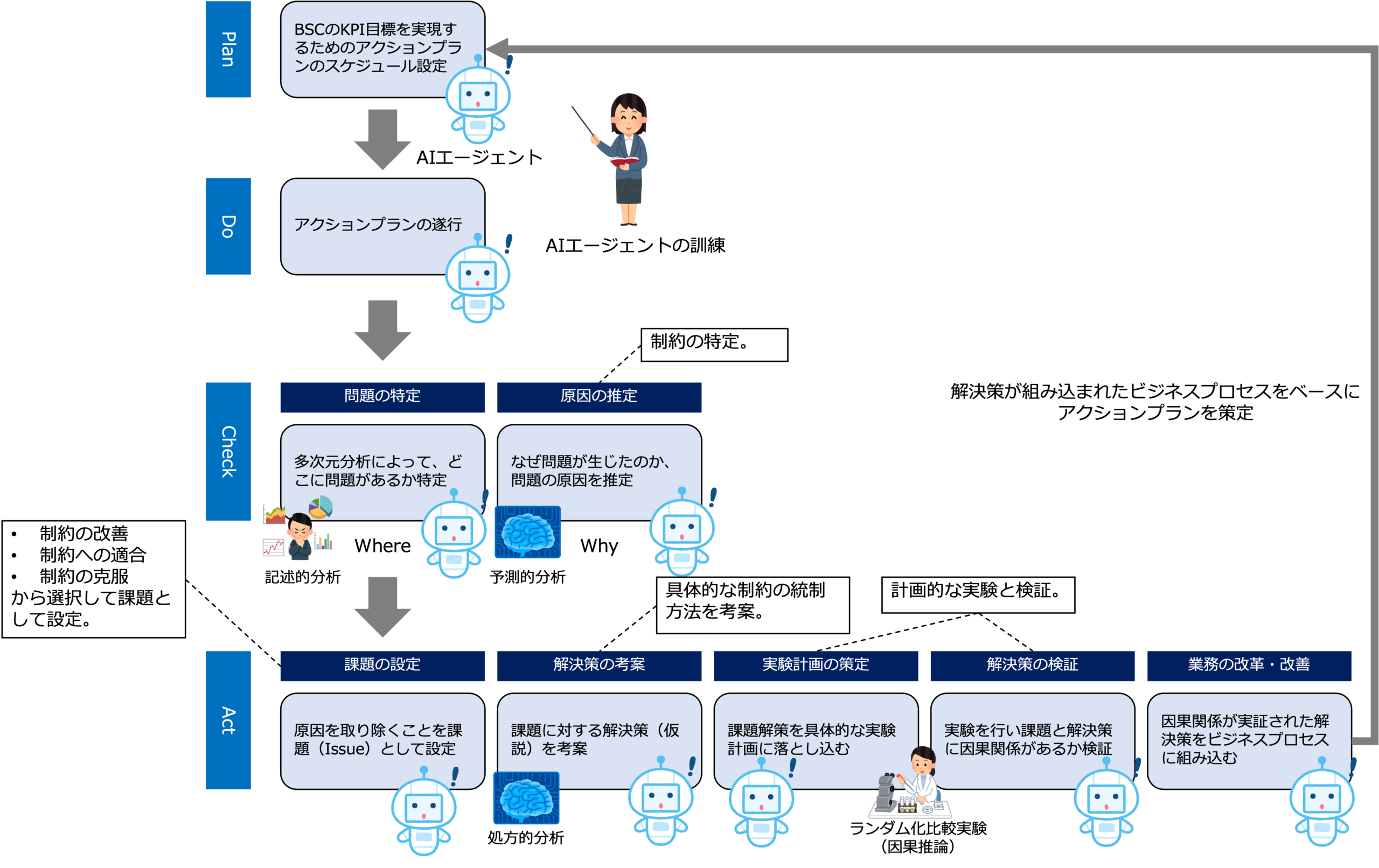また、解決策が、AIを組み込んだ新しいビジネスプロセスなど、設計レベルの見直しの業務改革・改善場合、AIを組み込んだアクションプランを検証し、「業務の改革・改善」に進みます。 - 業務の改革・改善