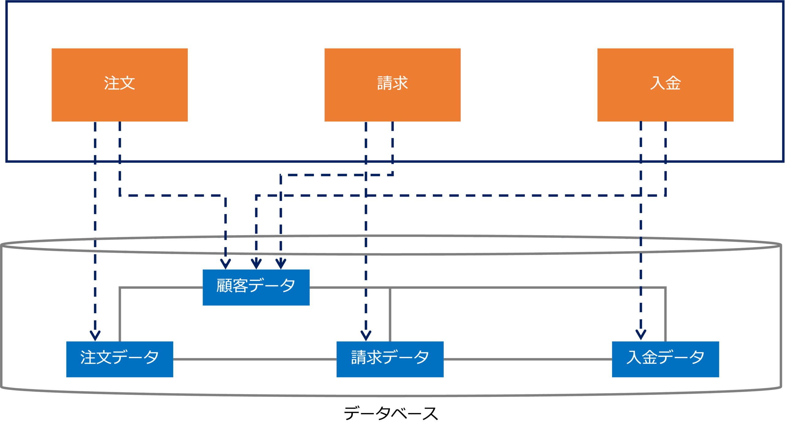 記事開発手法の変遷とドメイン駆動設計×マイクロサービスでも説明したように、データ中心アプローチ(DOA)は、処理からデータを完全に分離し、データを構造化するとともに全体で一元管理する手法です。