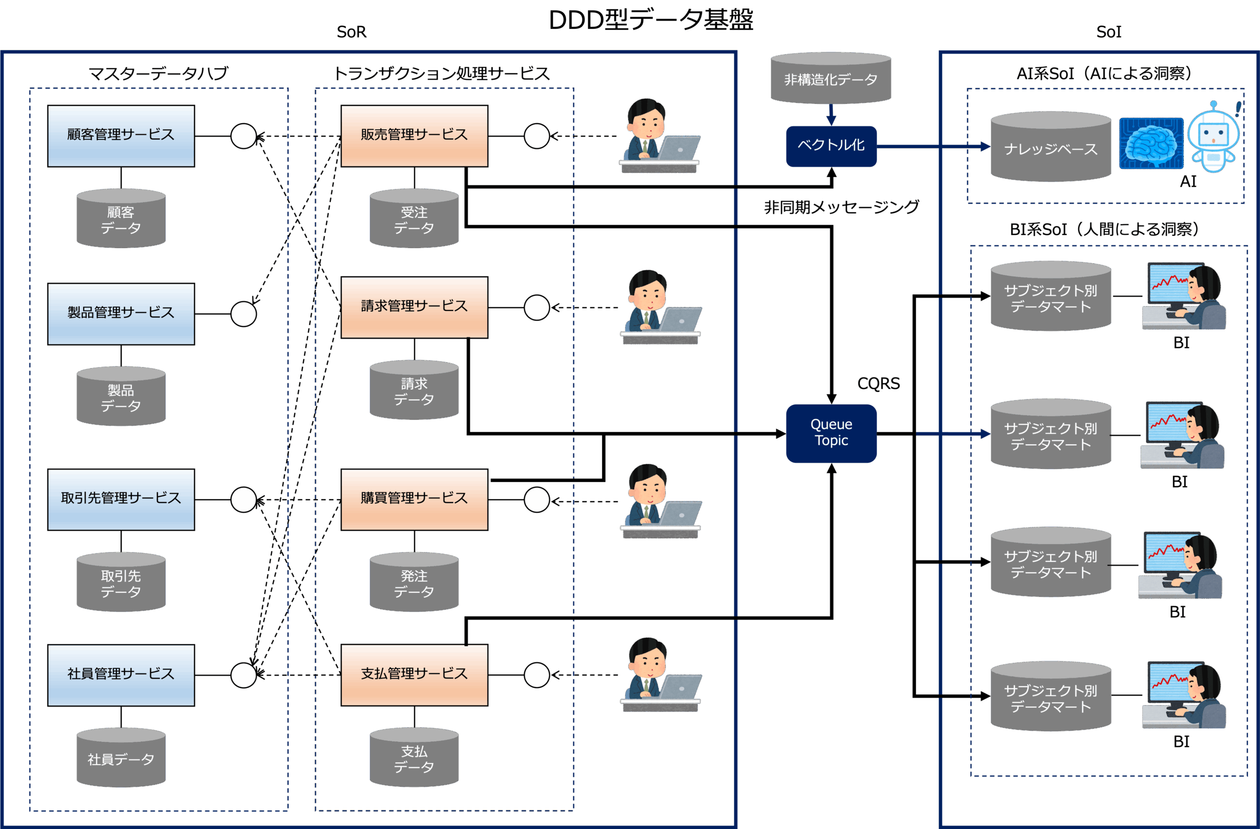 ドメイン駆動設計によって設計された業務ドメインごとにマイクロサービスを構築し、そこにデータをカプセル化することで構築するデータ基盤がDDD型データ基盤です。