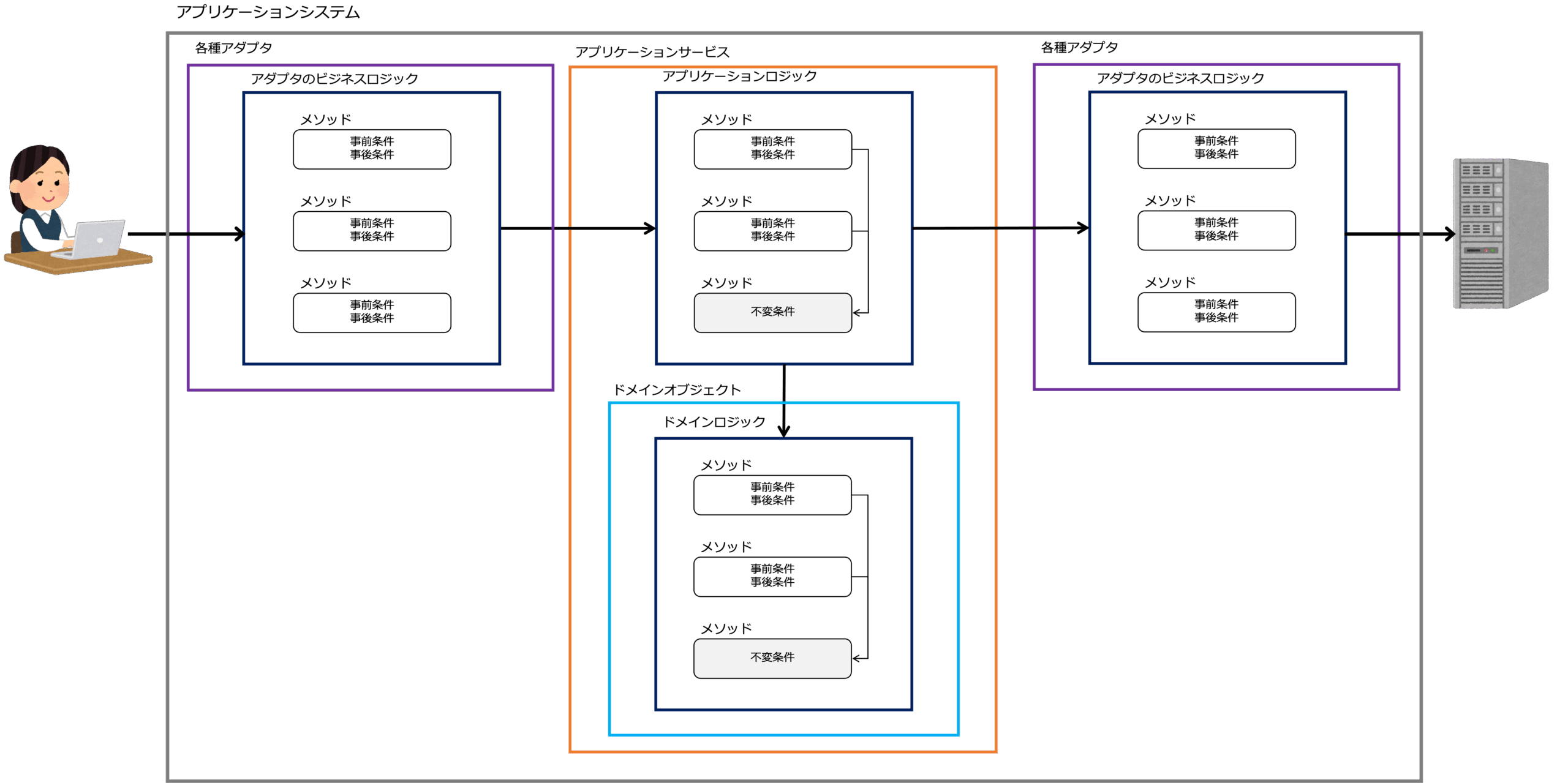 ここでは、アプリケーションサービスが実現すべくアプリケーションロジックを、契約による設計の、事前条件、事後条件、不変条件という観点で説明します。