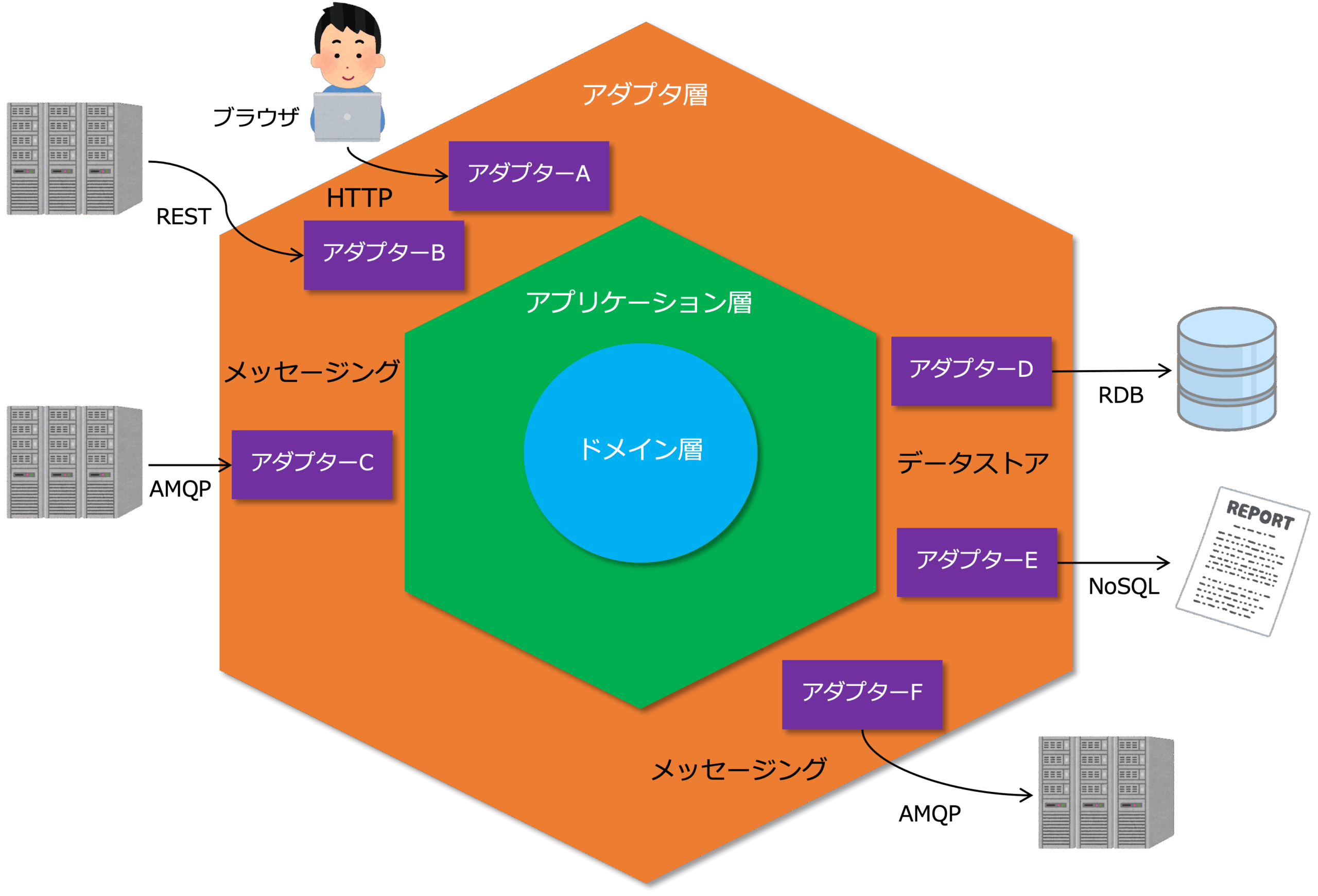 アプリケーションサービスは、ドメインオブジェクトの直接のクライアントで、ユースケースのシナリオを実現するためにドメインオブジェクトのメソッドを調整するだけの役割を担います。 - アダプタ層