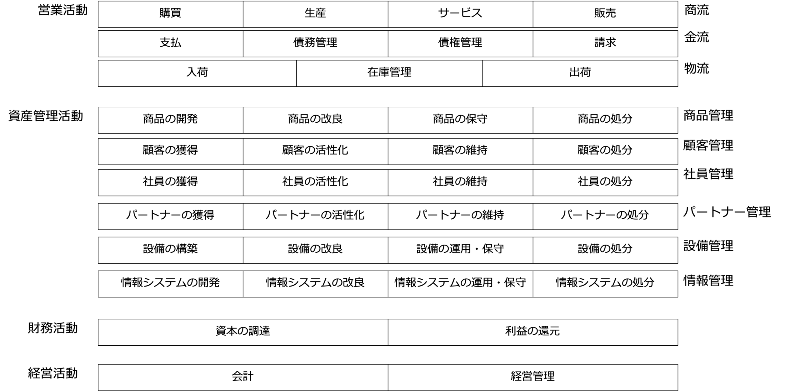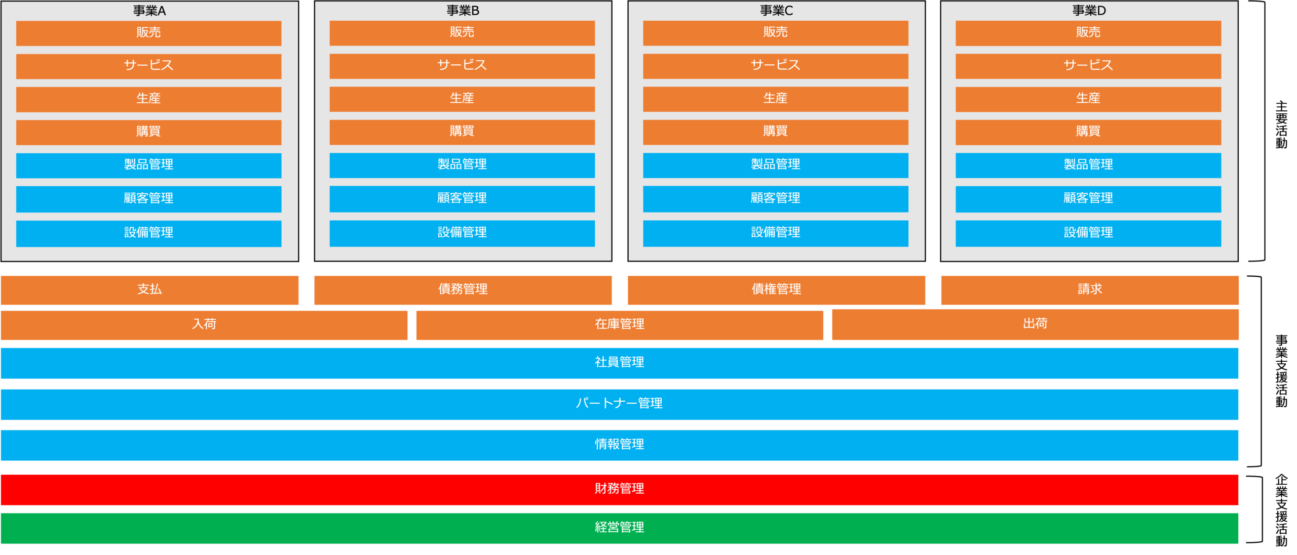 全事業の営業活動を支援する活動で、全事業共通の資材の調達、債権・債務管理、入出荷管理が該当します。 - 共通資産管理活動