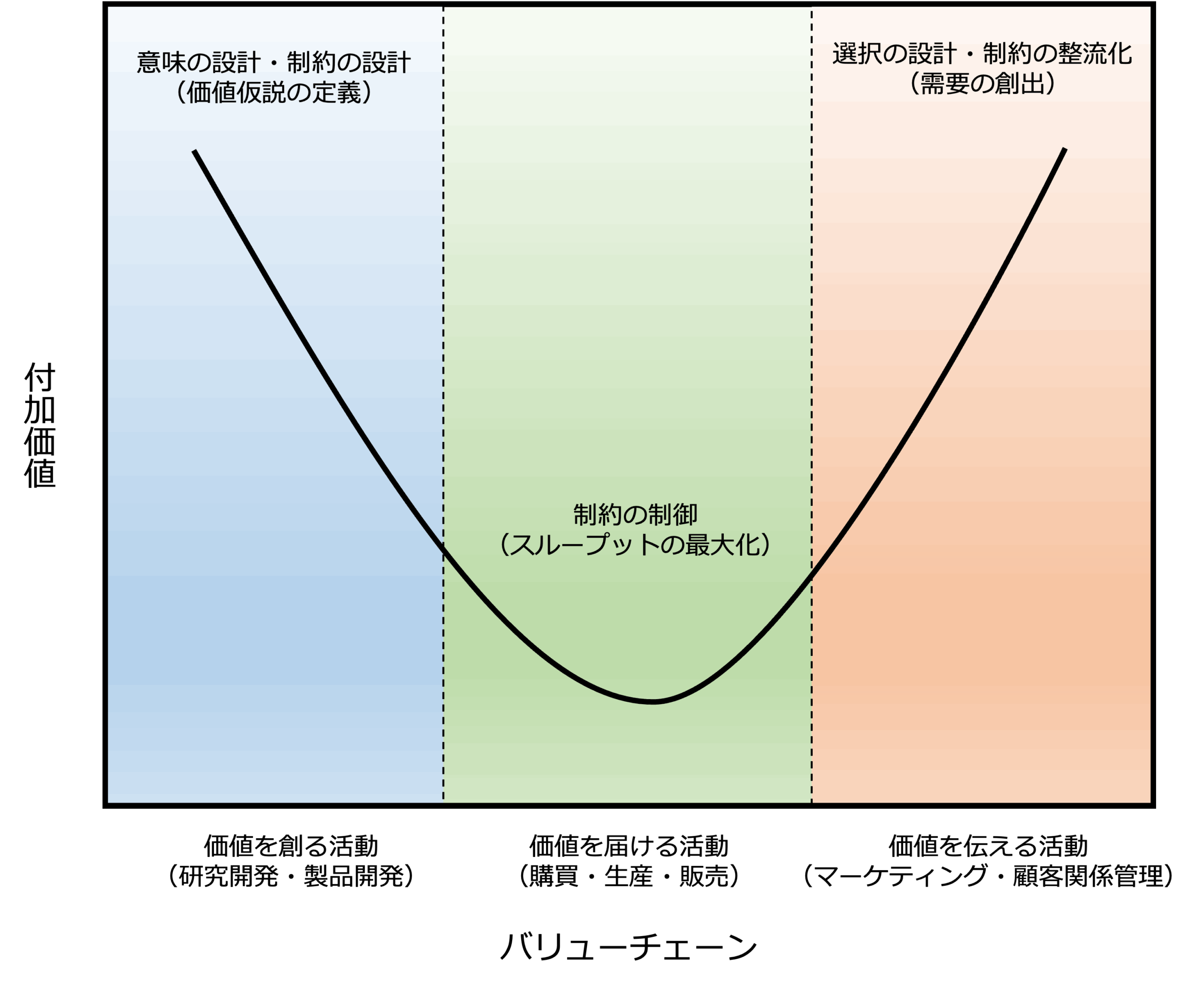 購買・生産・販売といった価値を届ける活動(Operation)に比べて、研究開発や製品開発といった価値を創る活動(Innovation)や、マーケティングや顧客関係管理といった価値を伝える活動(Communication)は、相対的に高い付加価値を生み出すと考えられます。