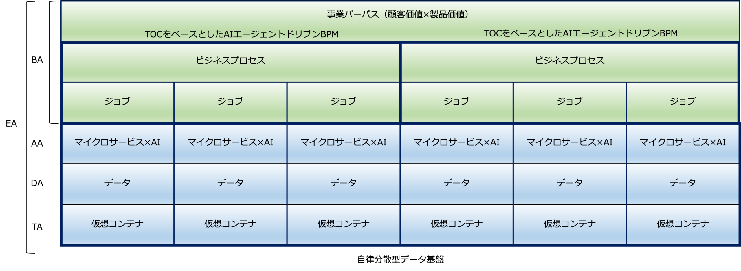 ビジネスプロセス単位に制約を制御するAIエージェントを組み込むことで、業務の流れを自律的に制御することができるようになります。 - ビジネスプロセスの連携がバリューチェーンとなって事業パーパスを実現するようにすること