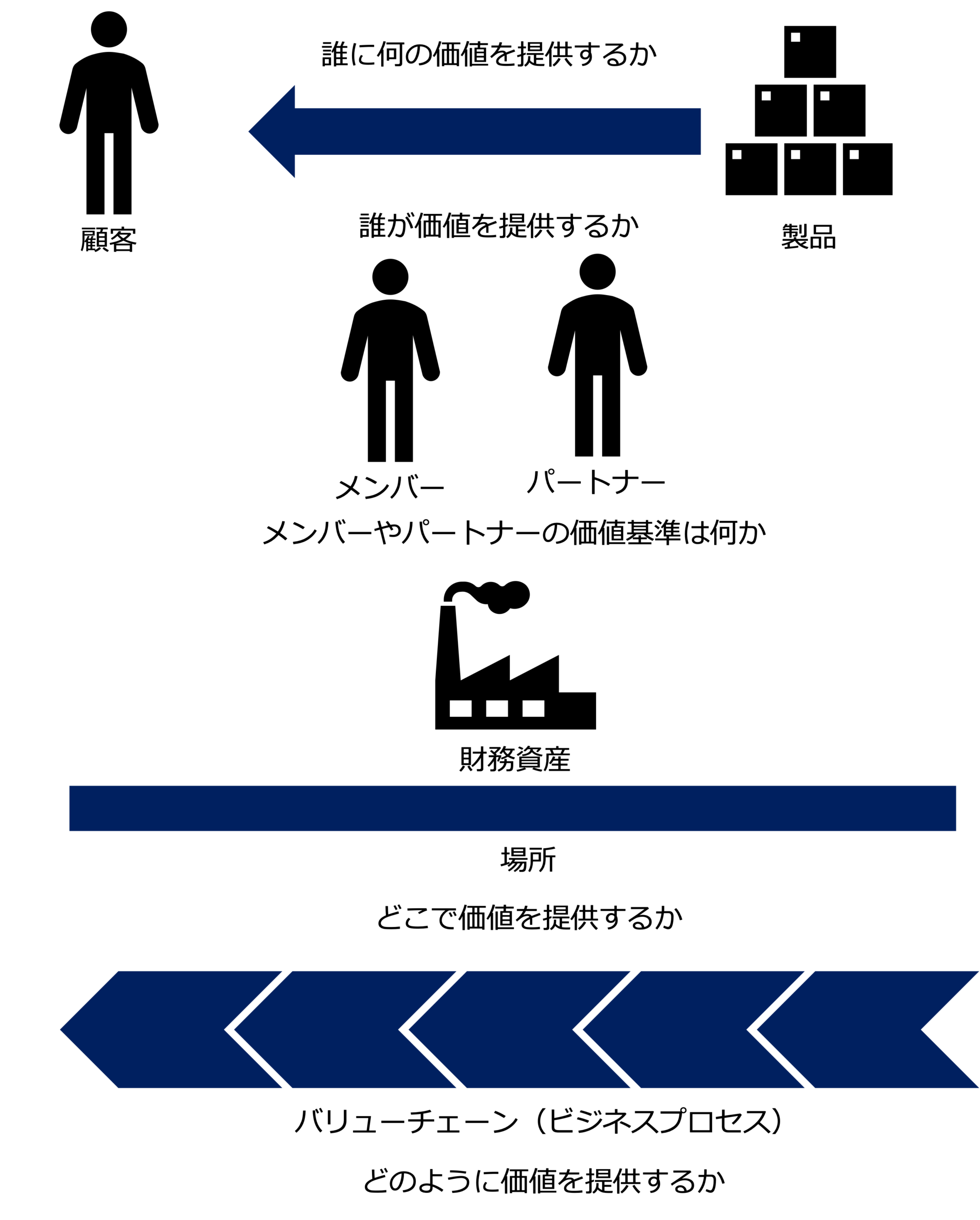 次に、誰(どんな価値基準を持った人)が、何を使って、どこで提供するのかですが、ここでは、価値を提供する人、物、場所という観点で、事業の境界(Boundary)を明確にします。