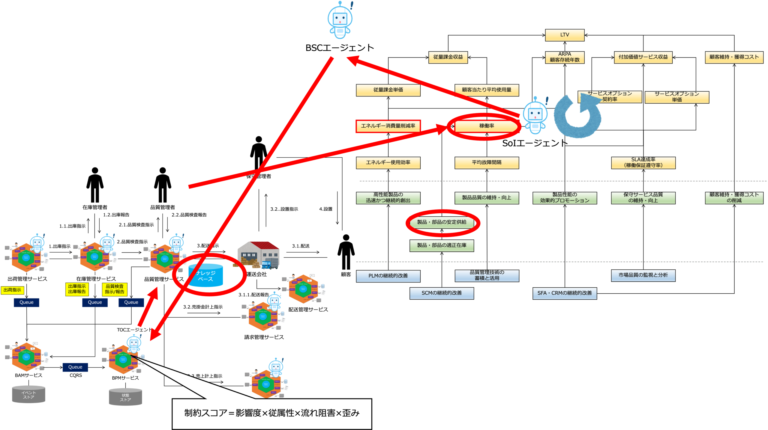 - BSCエージェントは、稼働率が落ちた原因は、バリューチェーンの目標である「製品・部品の安定供給」ができていないことだと推定し、それに関係するビジネスプロセスのTOCエージェントに、ビジネスプロセスの制約を統制するよう依頼する。