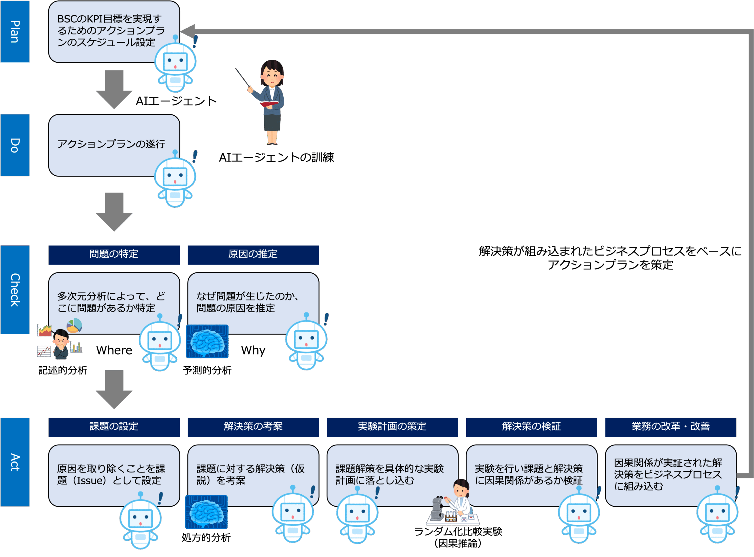 また、解決策が、AIを組み込んだ新しいビジネスプロセスなど、設計レベルの見直しの業務改革・改善場合、AIを組み込んだアクションプランを検証し、「業務の改革・改善」に進みます。 - 業務の改革・改善