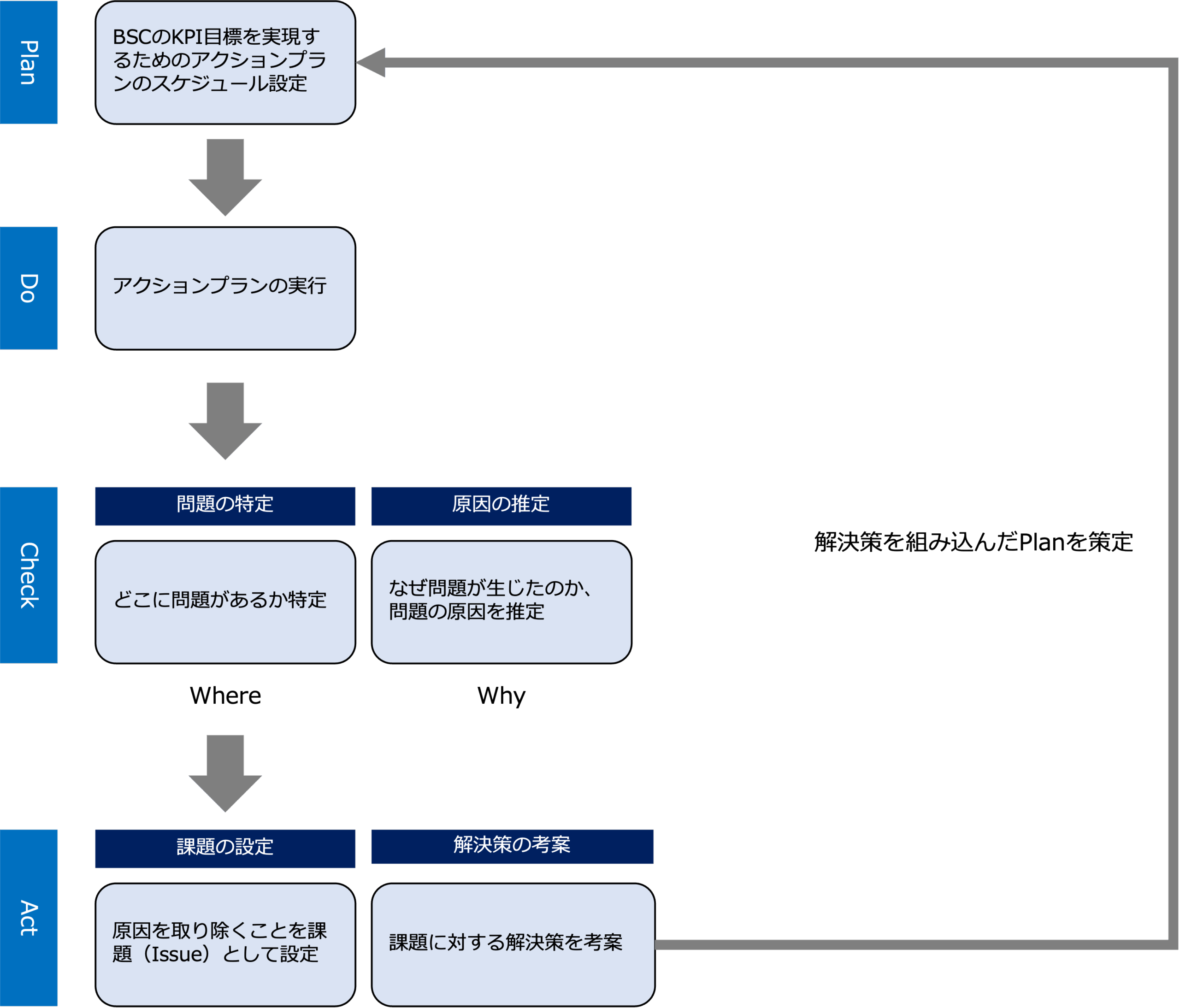 - BSCやKPIで目標を管理している場合、Planで、BSCのKPI目標を実現するためのアクションプランを策定します。