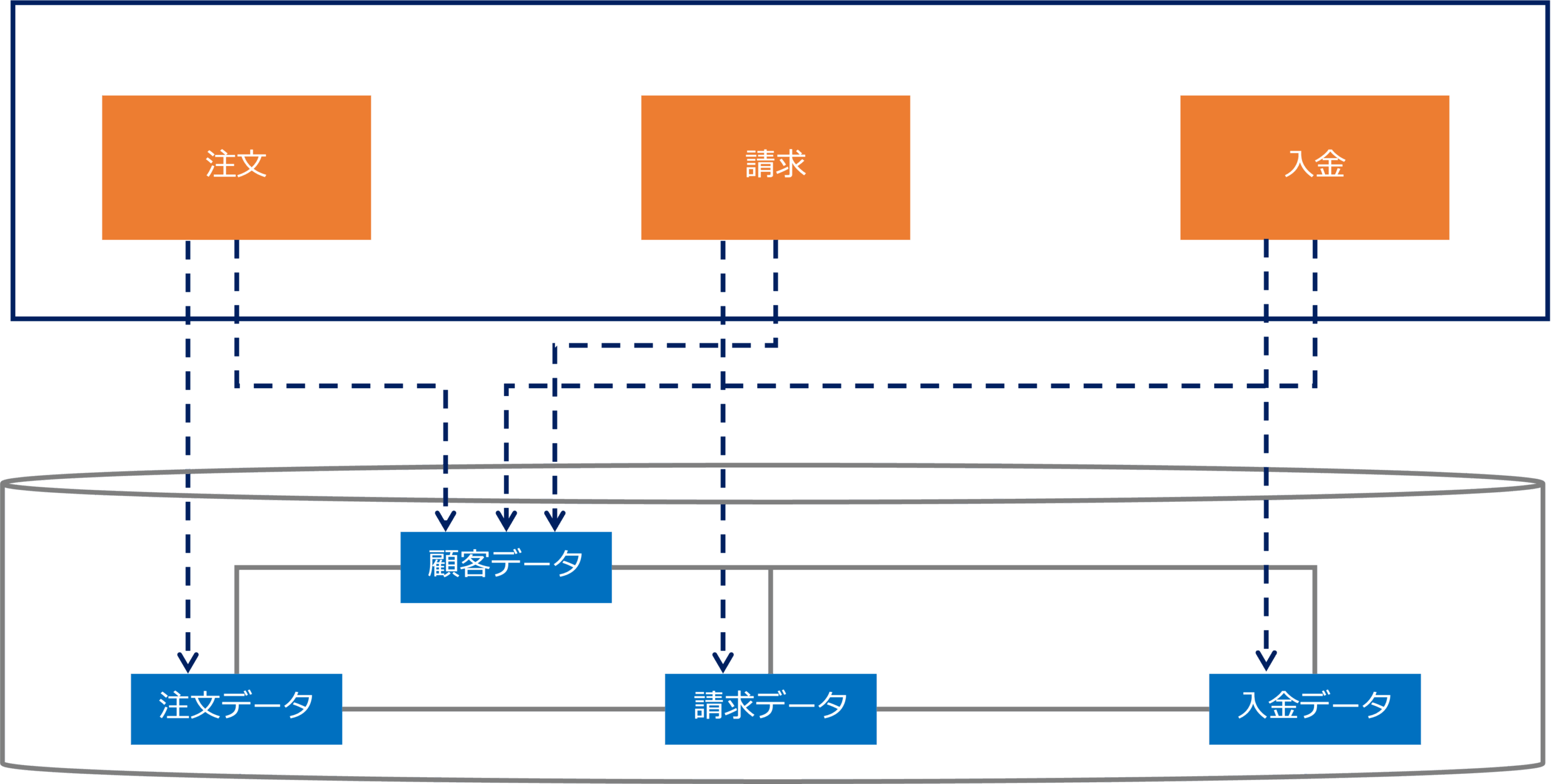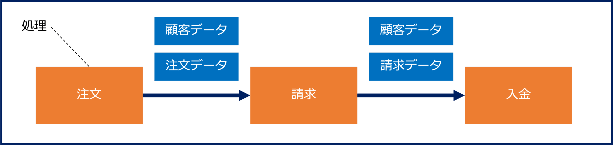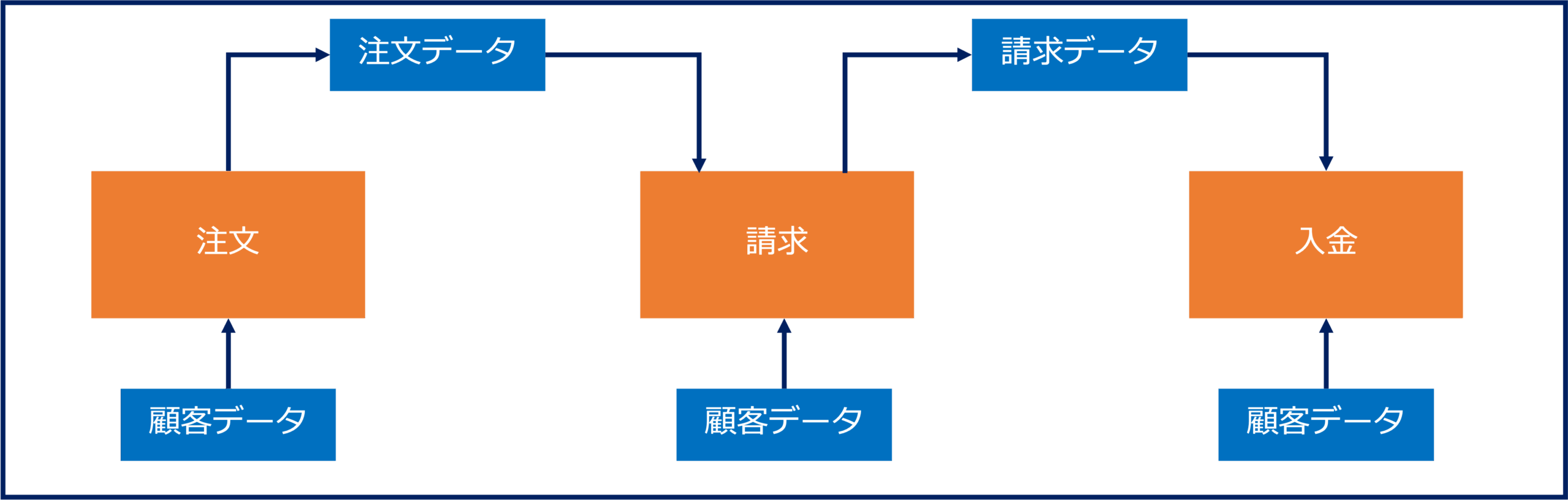 「注文」が「請求」に、「請求」が「入金」に依存しているため、一つの処理を変更すると他の処理にも影響が波及しやすく、いわゆるスパゲッティ構造になりがちでした。