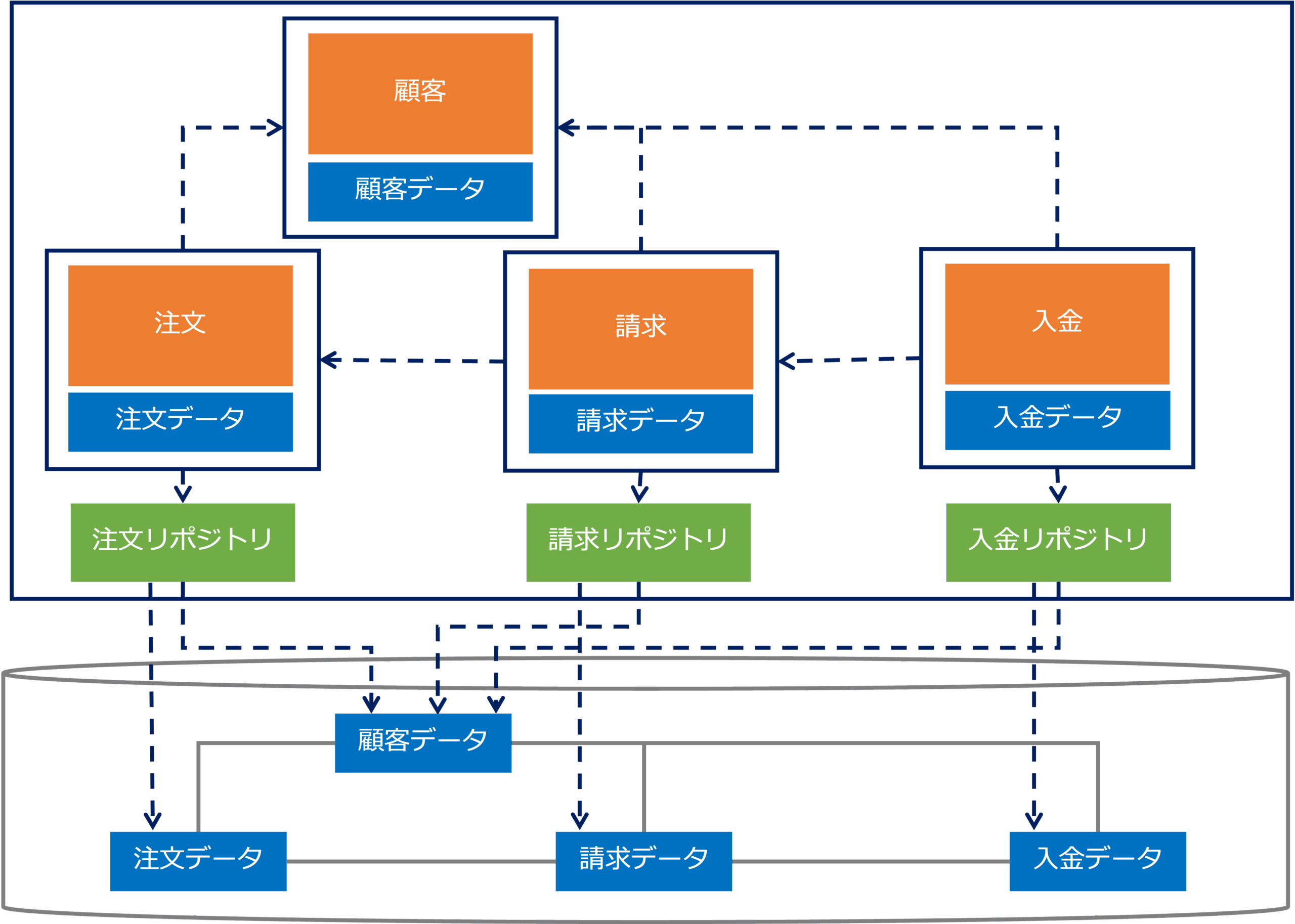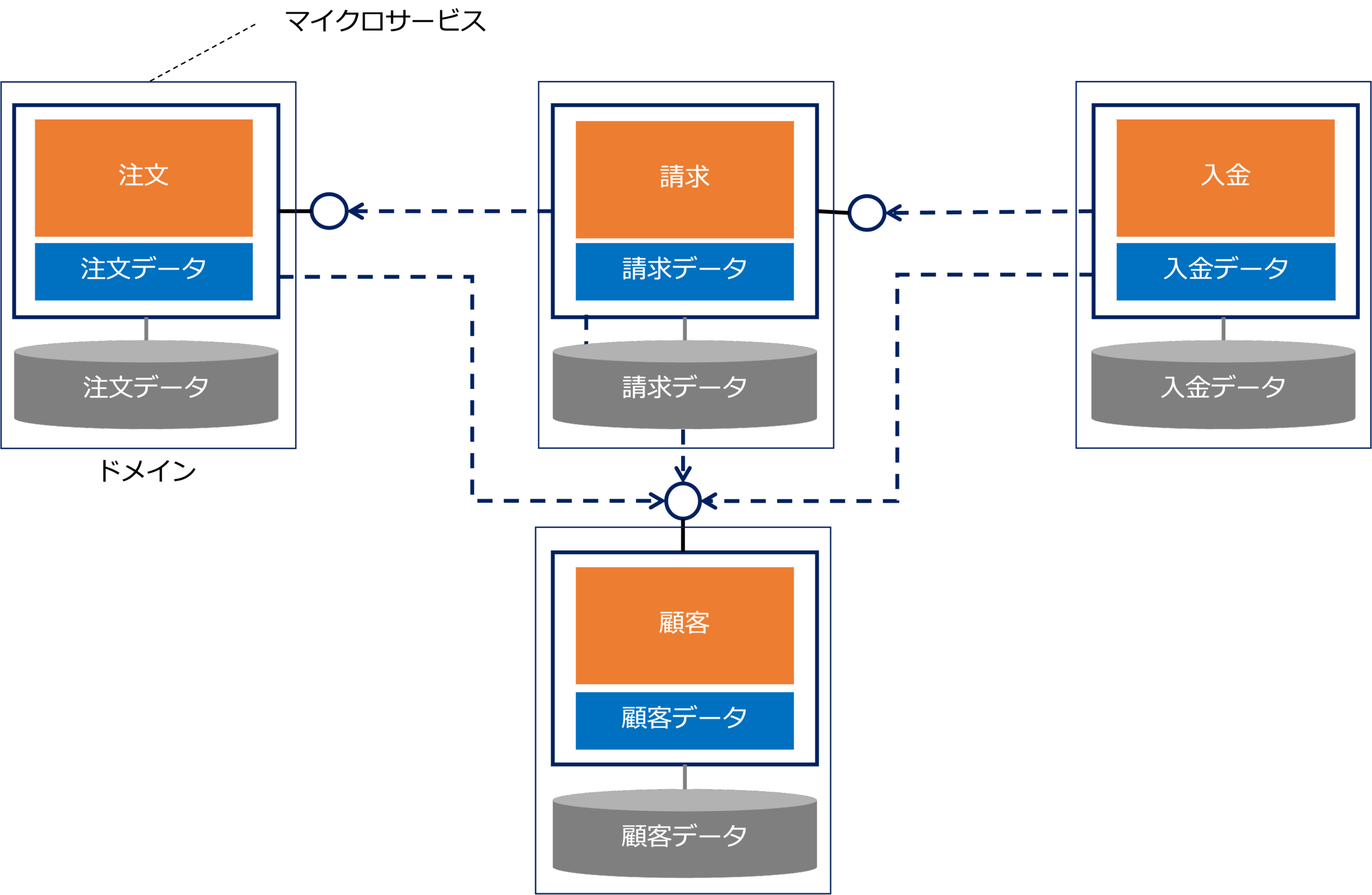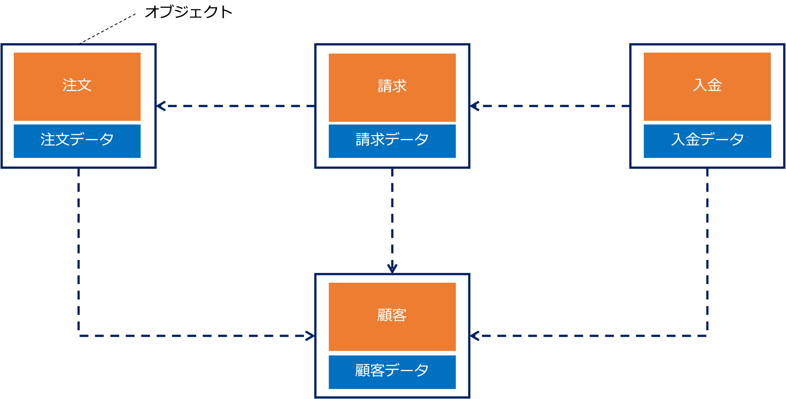 「注文」が「請求」に、「請求」が「入金」に依存しているため、一つの処理を変更すると他の処理にも影響が波及しやすく、いわゆるスパゲッティ構造になりがちでした。
