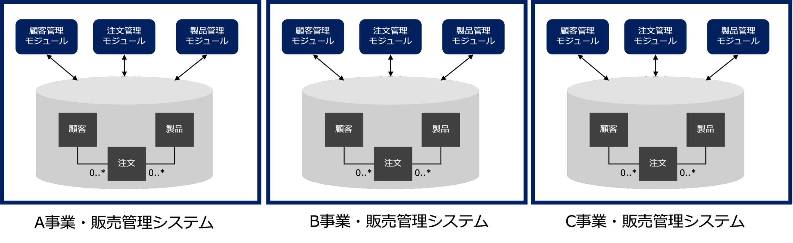 各プロセスがそれぞれ独自に「顧客データ」や「注文データ」を保持していたため、たとえば請求処理で顧客住所を修正しても、注文処理側の顧客住所は古いまま残るなど、データの整合性が保てないという問題が発生しました。