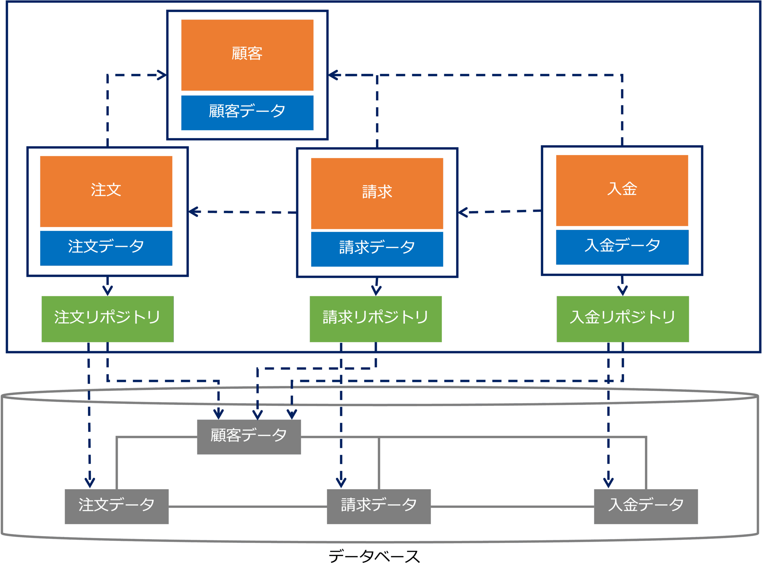 「請求」が「注文」に、「入金」が「請求」に依存しているため、一つの処理を変更すると他の処理にも影響が波及しやすく、いわゆるスパゲッティ構造になりがちでした。