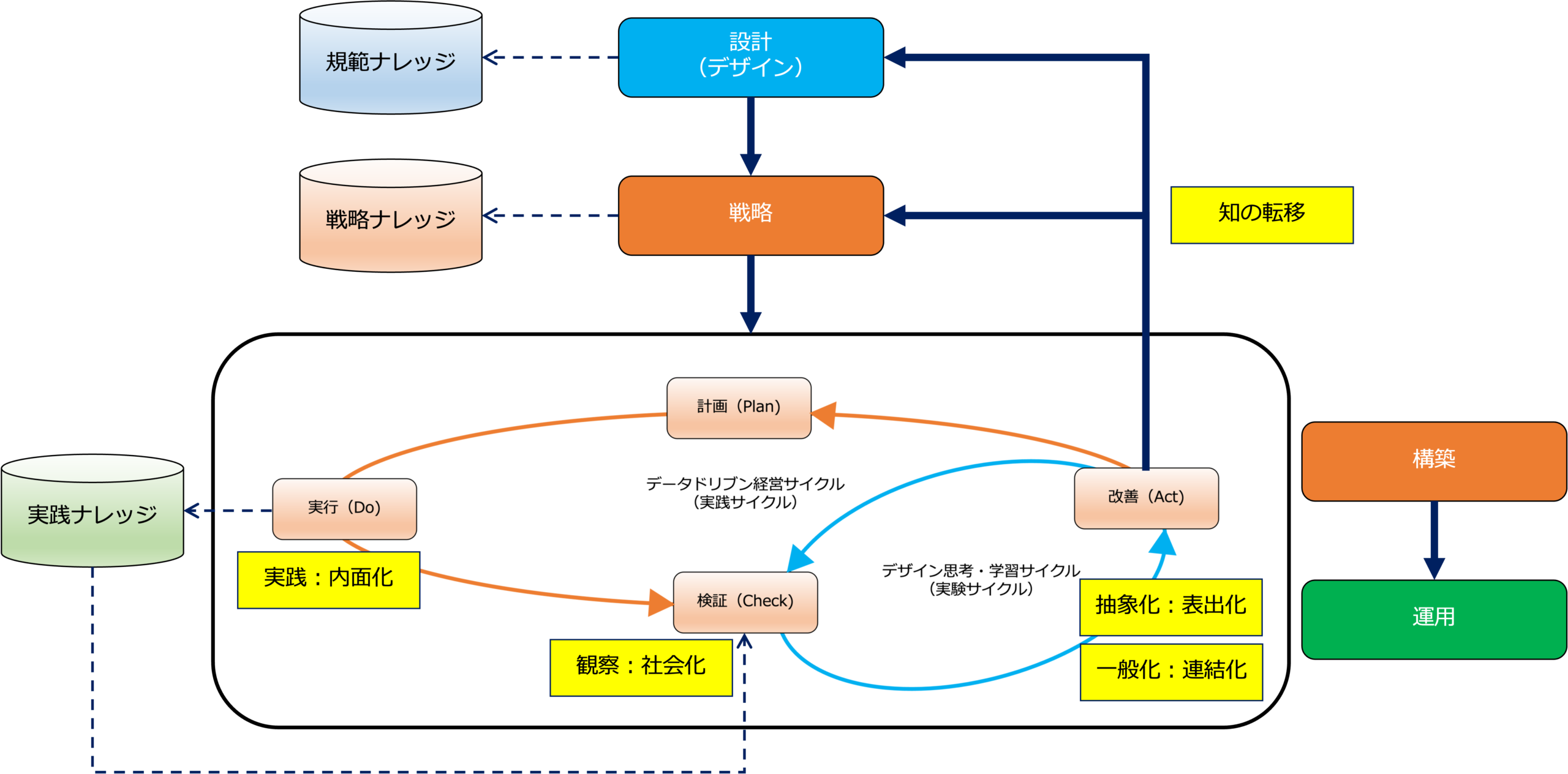 - 次の設計フェーズで規範ナレッジが改善されることで戦略ナレッジから規範ナレッジへ知識が「連結化」(形式知の連結)され、知が上位に転移する。