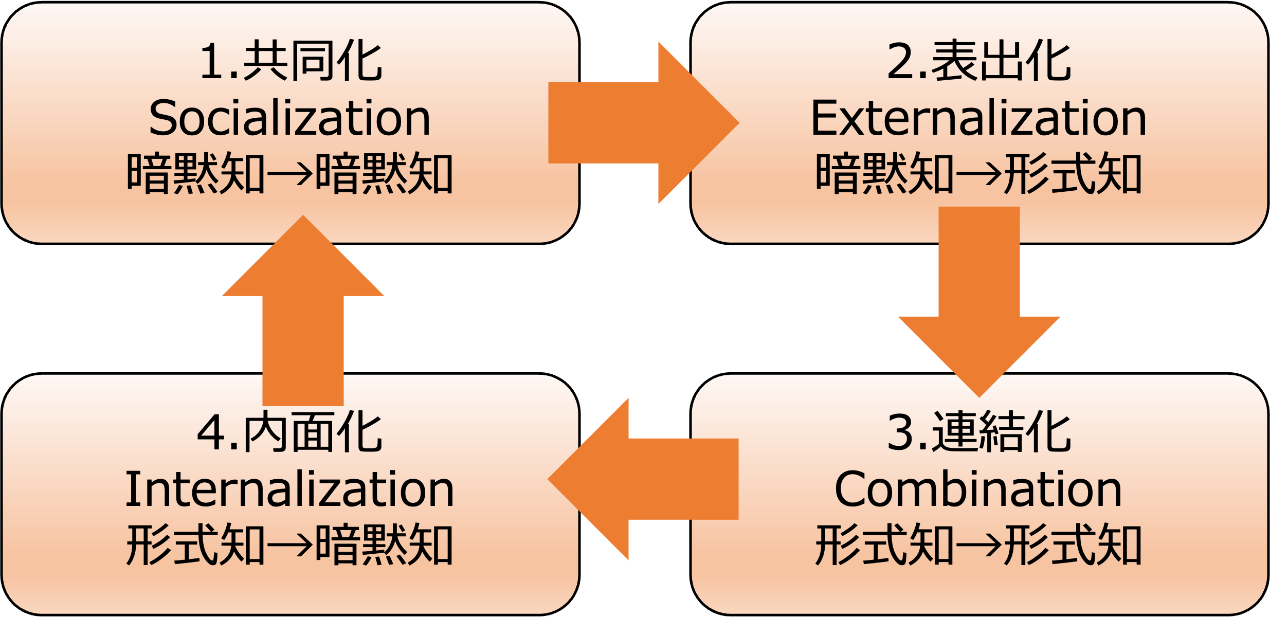 AIを用いた知識の自動統合なども連結化の発展形として注目されています。 - 内面化(Internalization)