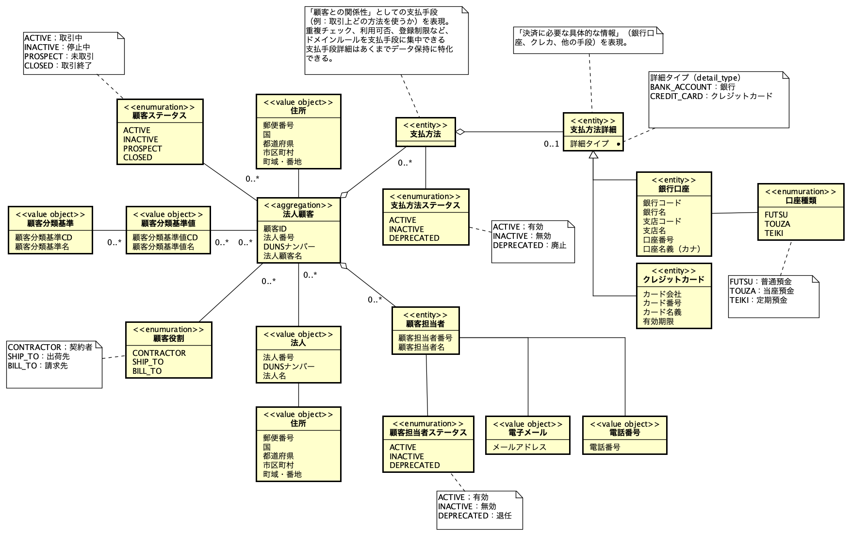 これを見ると、中心に集約ルートである法人顧客があり、その周辺を、法人顧客に関係する他のエンティティや値オブジェクトが取り巻いていることがわかります。